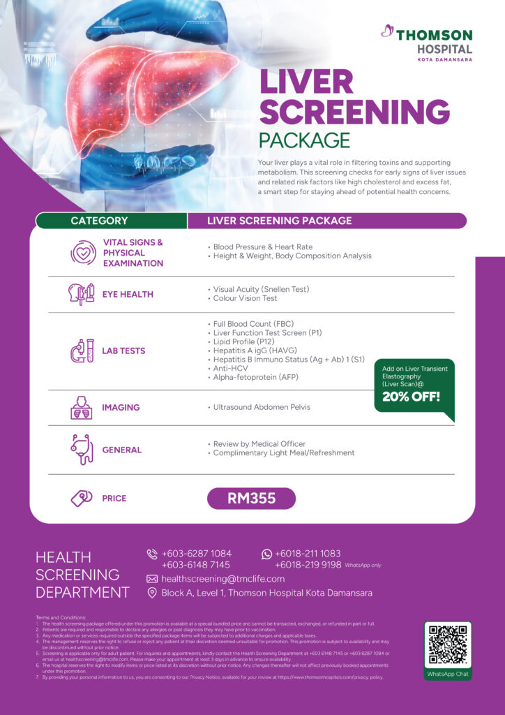- Screening is applicable only for adult patient. For inquiries and appointments, kindly contact the Health Screening Department at +603 6148 7145 or +603 6287 1084 or email us at healthscreening@tmclife.com. Please make your appointment at least 3 days in advance to ensure availability.